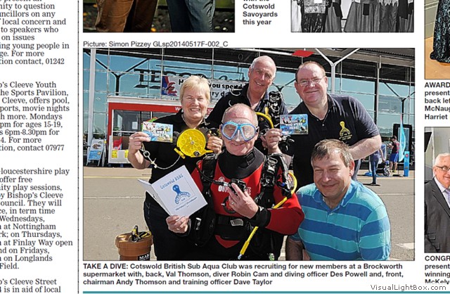 Hoping to get more recruits to join the Club, a number of members got together and manned a stand outside Tesco in Gloucester. Andy and Jacqui were even brave enough to wear their drysuits for a time, even in the very hot conditions! The event also appeared in the Gloucestershire Citizen as well. Thanks and well done to everyone who took part!