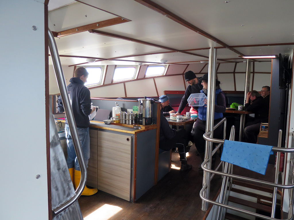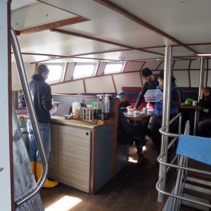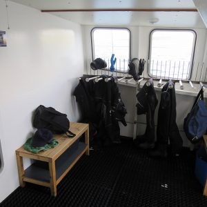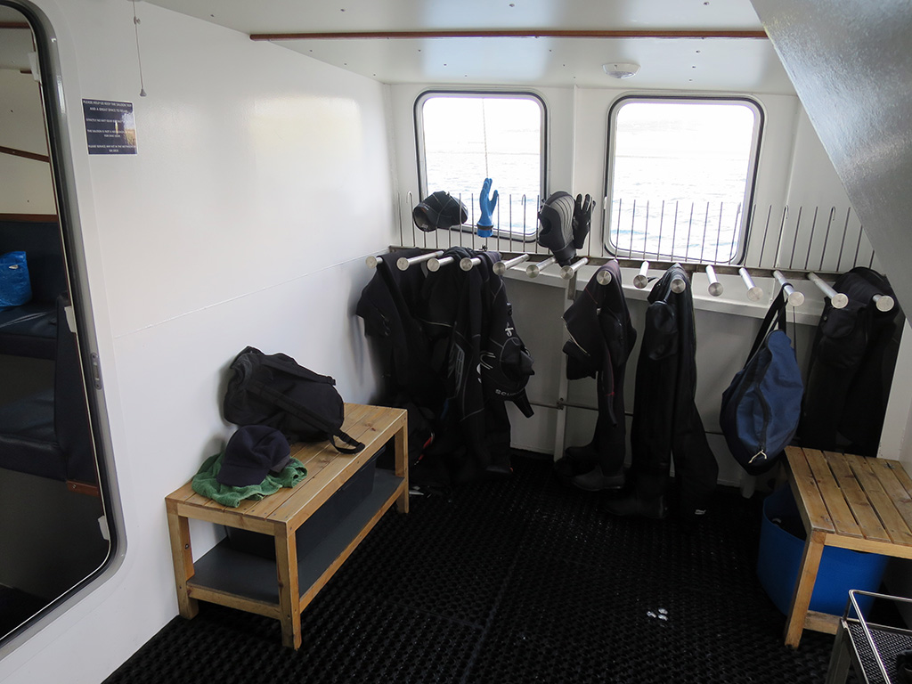 At this point I’d like to mention that the photos don’t do the boat justice. Here was a purpose built dive boat, with comforts not seen in UK waters before! Large dive deck with in-situ cylinder filling, enclosed changing room with drysuit, gloves and hood hangers, plenty of space for fondling with cameras and the like, large lounge and even a downstairs warmed changing room and lockers!
