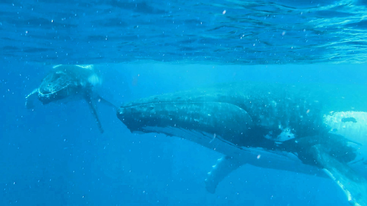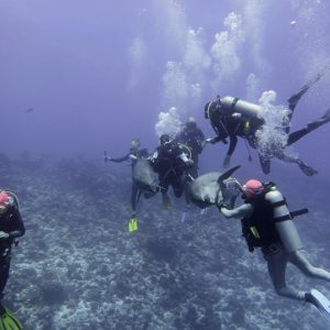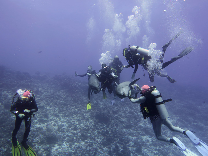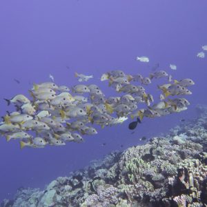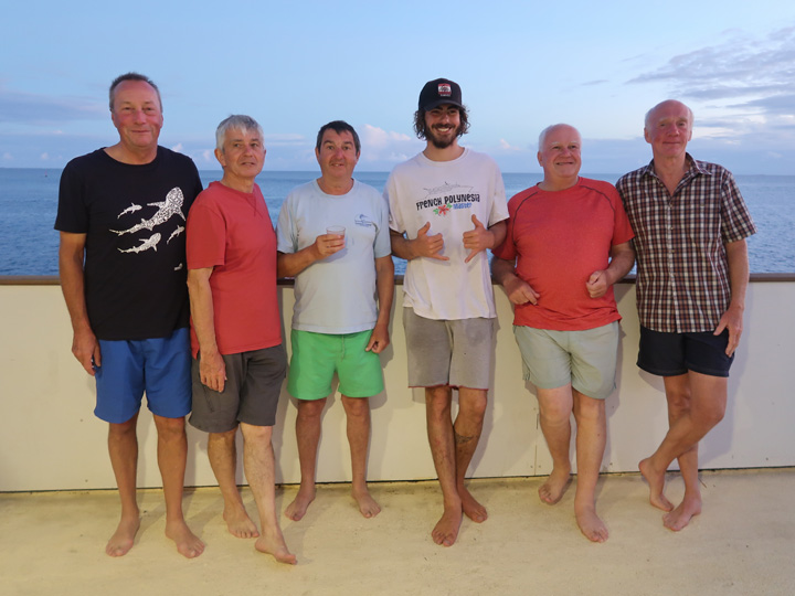 Five of us made the very long journey to Tahiti in French Polynesia to dive an area we had not been to before. On arrival we spent a few days getting over jet lag and wandering round and over the island. Before joining the liveaboard, French Polynesia Master, we went on a side excursion to snorkel with humpback whales. Wow, what an experience that was!! We spent time at close quarters with a number of mums and their babies. While mum rested about 15 metres below us, baby would pop up by the side of us every few minutes to breathe. The babies were impressive weighing in at about 2 tonnes but the mums, who came up every 15 minutes or so, were enormous! Definitely one to retain in the memory banks.