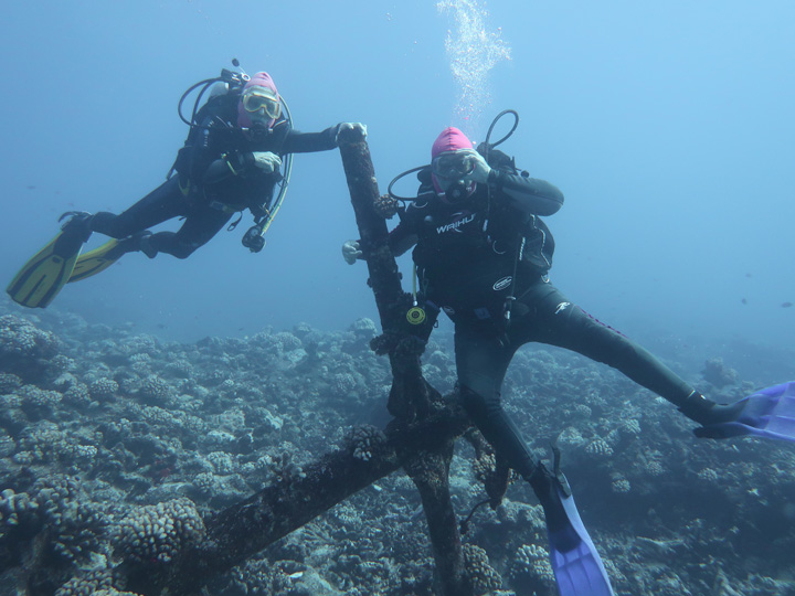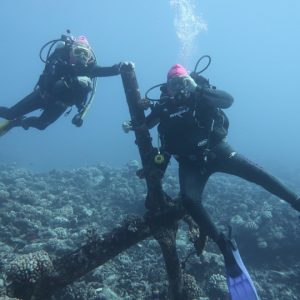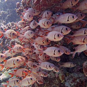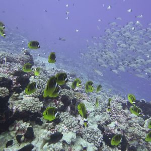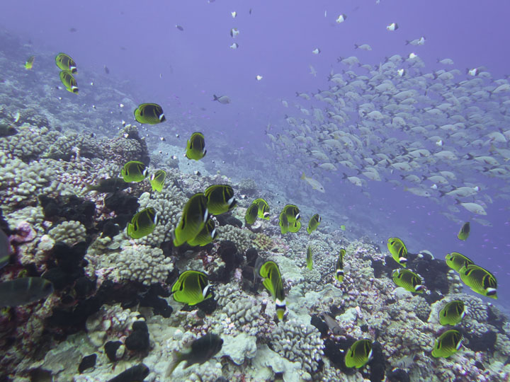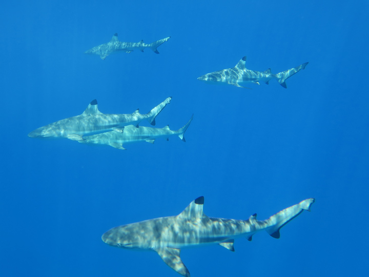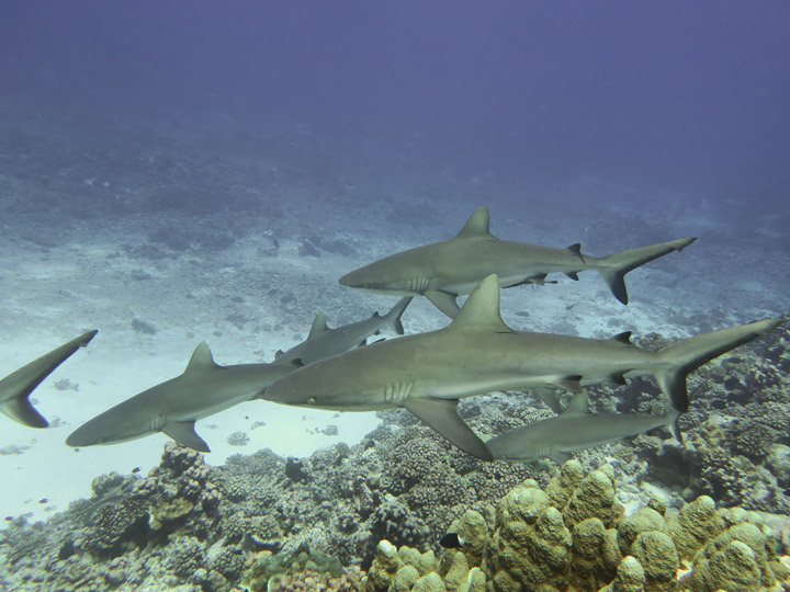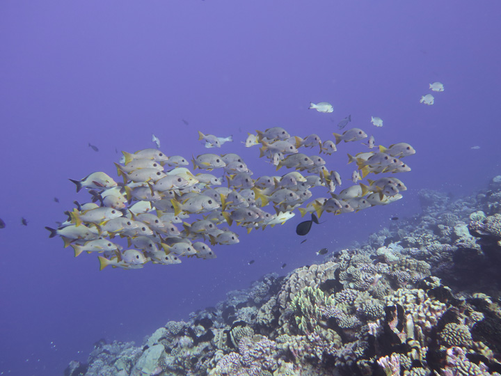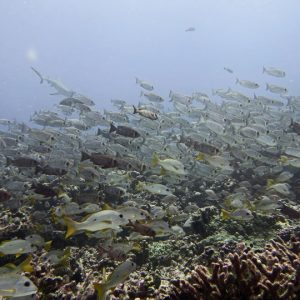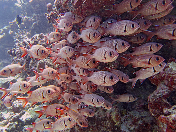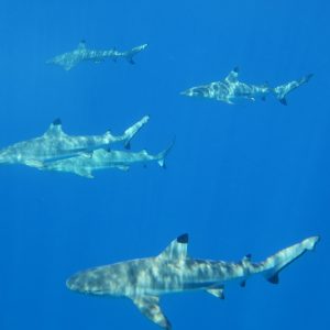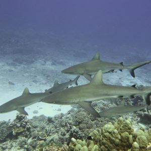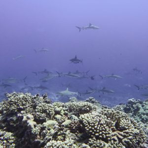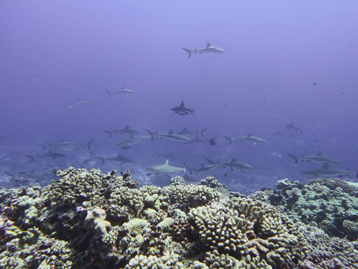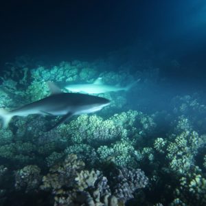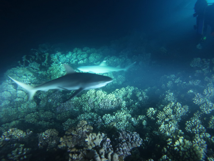 When conditions were right we dived in the channels through the atoll fringing reefs. These were pure adrenaline rides with very fast currents sweeping us along. Where we could we would hang on to watch the many sharks swimming gracefully in these currents showing us how it should be done. One of the other highlights was a night dive on the edge of one of these channels. The light from our torches attracted the grey and white-tip reef sharks which were hunting for food. We ended up with dozens swarming around us and getting very close. They weren’t interested in us a food, they were chasing the fish, but the occasional one would get a bit too close for comfort and need nudging away! I don’t normally bother with night dives but I was glad I did this one.