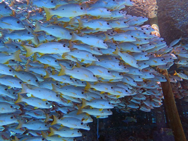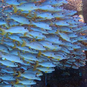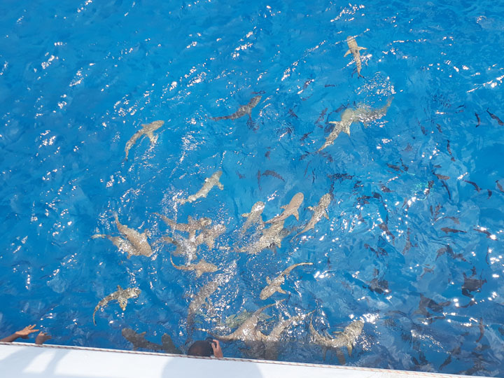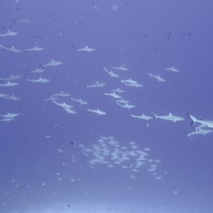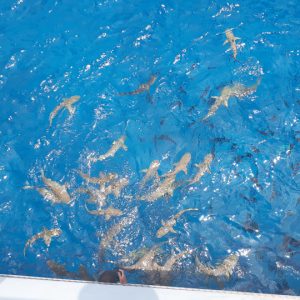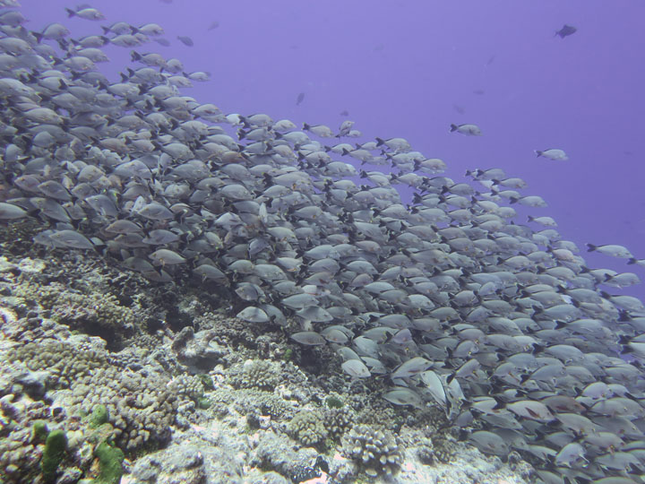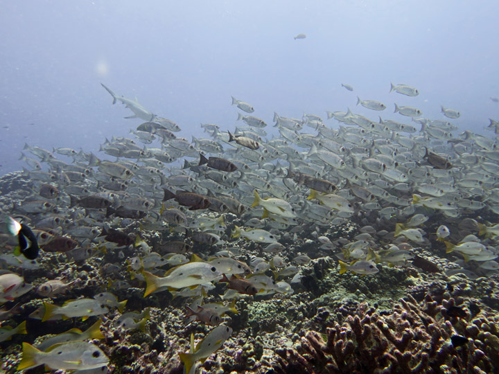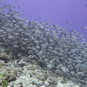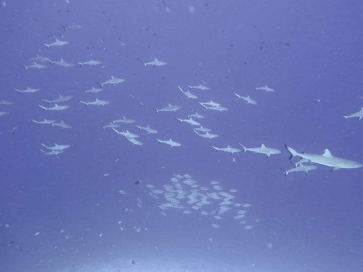 We spent 10 nights on the liveaboard visiting a number of different atolls – all turquoise waters and palm trees – very nice. The first few dives were a little disappointing as the coral in this area is not the best and we didn’t see much big stuff, but this changed after a few days. As you can see from the photos, we met up with shoals of fish, friendly dolphins, mantas and loads and loads of sharks. These were mainly grey reef sharks playing in the currents, with black tips hanging around the boat waiting for food scraps. We also saw a lemon shark which was another first.